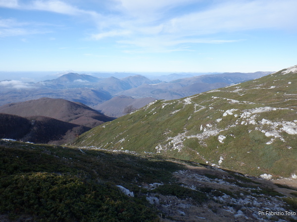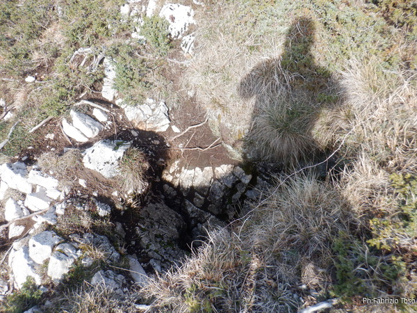 Una volta scavallato facciamo una breve ma doverosa sosta ad ammirare il panorama. La nostra grotta e’ la’ sotto. Faccio un giro largo per rivedere la grotta “pozzo antipasto”. La ritrovo con l’aiuto di Luca, la saluto ma dimentico di farle le foto. Peccato, sara’ per la prossima volta.