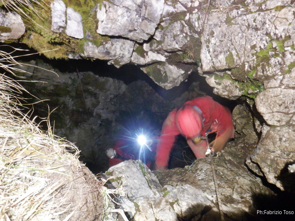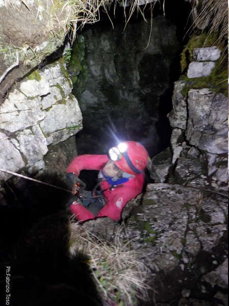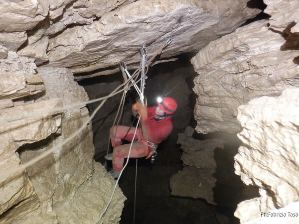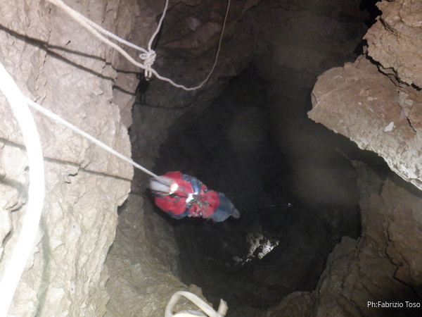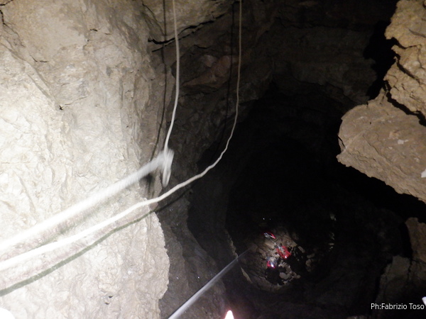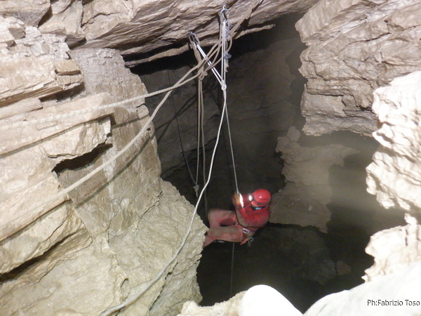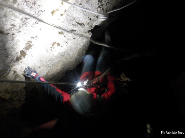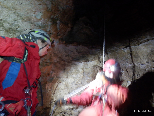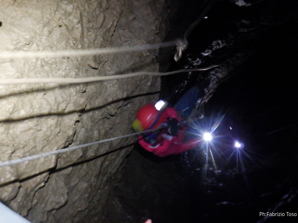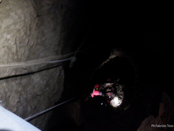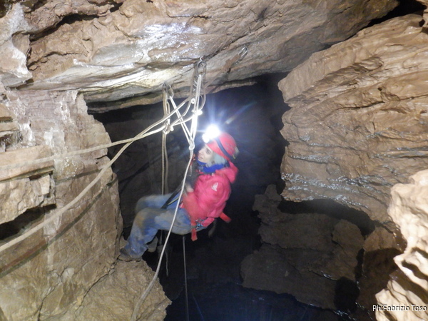 Vado avanti con il necessario per armare la discesa. Ci sono gia’ delle corde che armano la via per una diramazione in esplorazione da parte di altri amici. Sistemo la nostra corda e metto anche gli attacchi necessari per potermi assicurare e dare una mano a chi scendera’, ma senza intralciare troppo il passaggio. Per prima propongo Eirene, sicura e affidabile passa velocemente e scende nel buio.