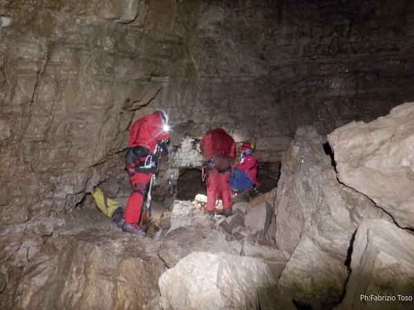 Sono ancora intento a guardare vari buchi infimi e senza aria quando sento Alessia, di ritorno dalla sua esplorazione, che mi chiama per tornare indietro. Affrontiamo rapidamente la salita per tornare al salone dove troviamo i nostri comodamente accampati che sistemano le loro cose per il pranzo.