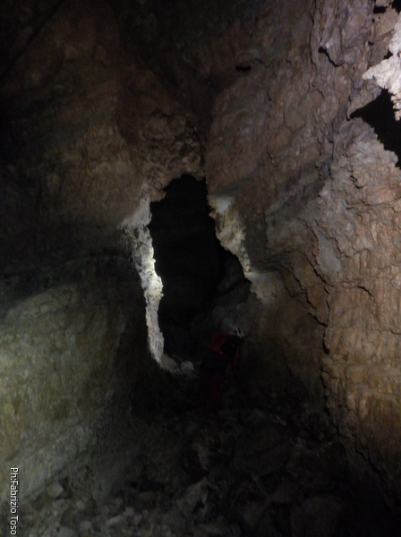 Disarrampichiamo il passaggio iniziale e poi lascio che Alessia vada in esplorazione per suo conto. Io gironzolo per questi ambienti fino a trovare una breve risalita col fondo di breccia fine che porta ad una minuscola saletta dove mi fermo a contemplare possibili ma strette prosecuzioni.