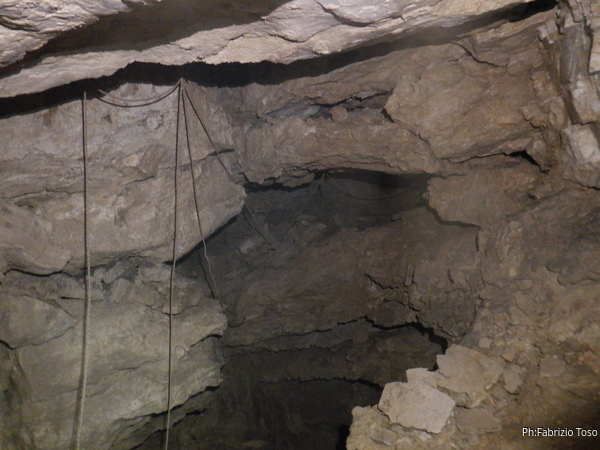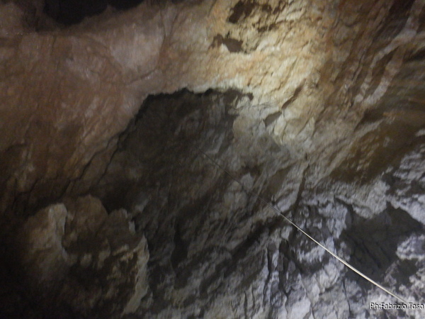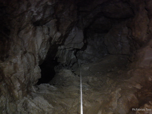 Gia’ dall’ingresso noto il doppino telefonico che ci seguira’ per tutta la parte della grotta che percorreremo. Cerchiamo di disturbarlo il meno possibile perche’ chissa’ se dovra’ servire ancora. Non so chi lo abbia lasciato e spero appunto che sia stato fatto pensando ottimisticamente ad un futuro utilizzo. Personalmente sono scettico che il doppino resista nel tempo al ripetuto passaggio degli speleologi che frequentano la grotta. Cercare una eventuale interruzione nella continuita’ del doppino porterebbe un impiego di tempo e forze confrontabile alle energie necessarie per passarlo ex-novo. Ma cosi’ e’, cercheremo di fare attenzione.
