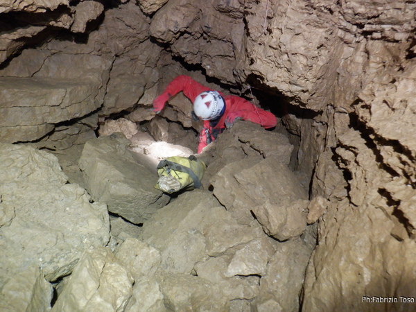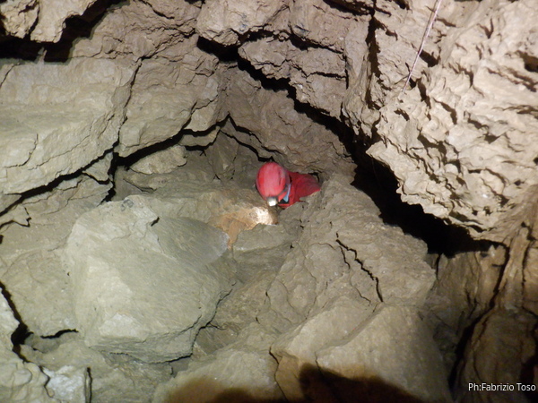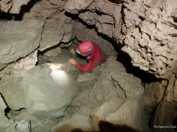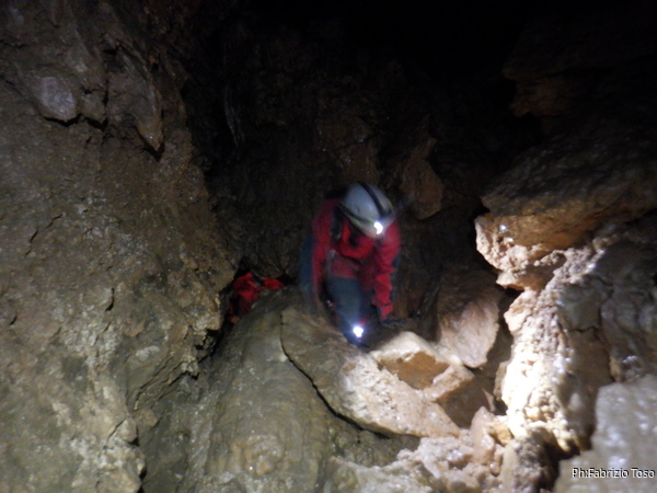 Ancora per primo affronto impavido le tenaci strettoie che ci separano dal P23. Questo pozzo e’ conosciuto anche come “pozzo del Canapone” perche’, si racconta, che i primi esploratori siano stati dei ragazzi di Guarcino che hanno sceso il pozzo utilizzando una corda di canapa (il canapone, appunto) e la sola forza delle braccia. In attesa che arrivi a me la corda per armare faccio foto ad Alessia mentre passa la strettoia.