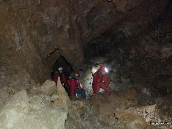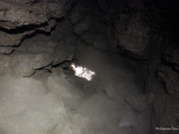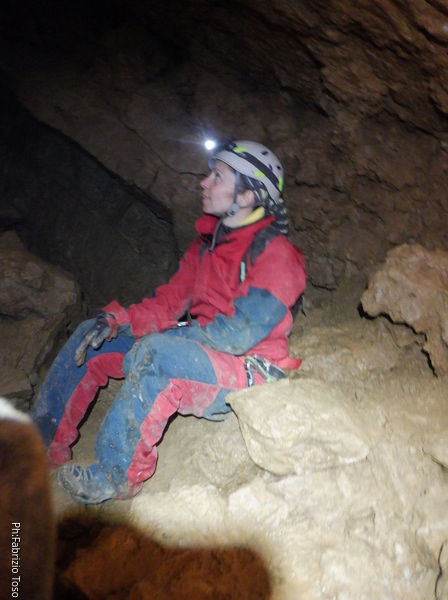 Mentre il nostro gruppetto si sistema vado alla prosecuzione per vedere se e’ facilmente affrontabile. Lo e’. Chiamo a raccolta i volenterosi ma solo Alessia ha voglia di visitare la Santa Barbara, la sala successiva.