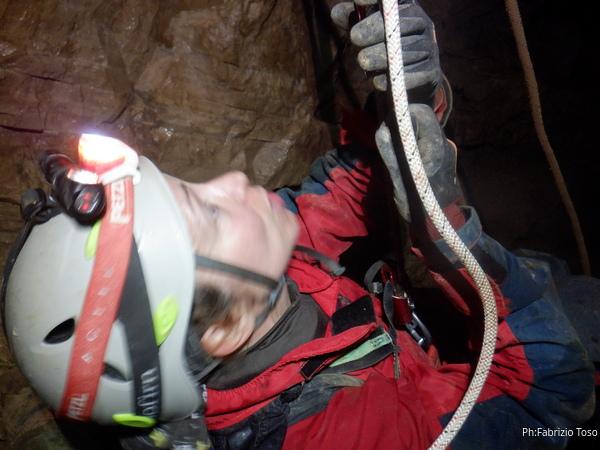 Nonostante la sua poca esperienza in grotta anche la discesa vera e propria sembra non rivestire difficolta’ per lei. In ogni caso per prudenza Eirene e’ sotto a fare sicura.
