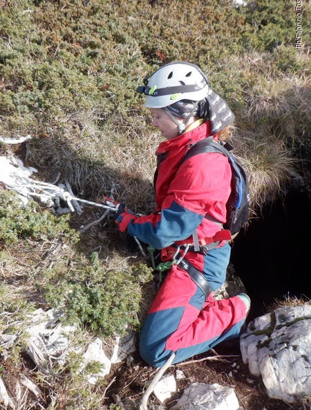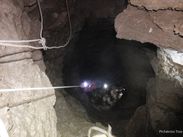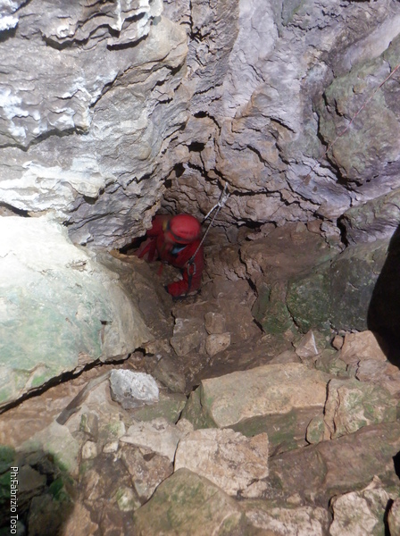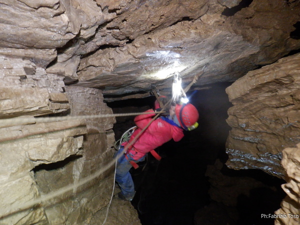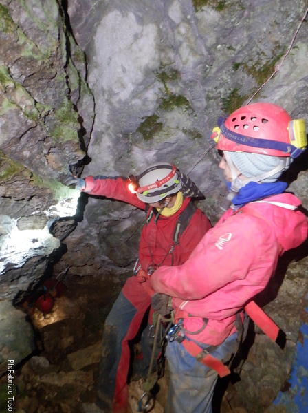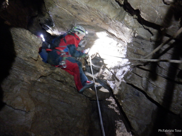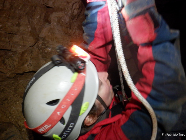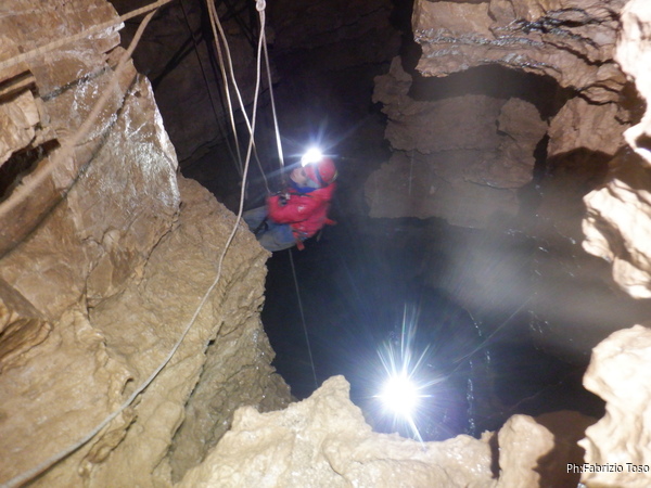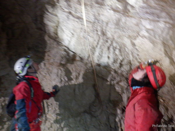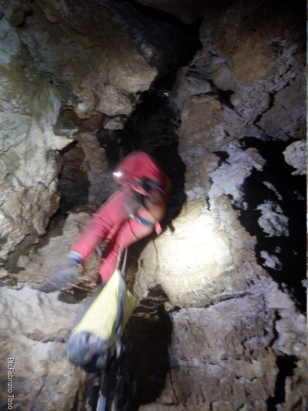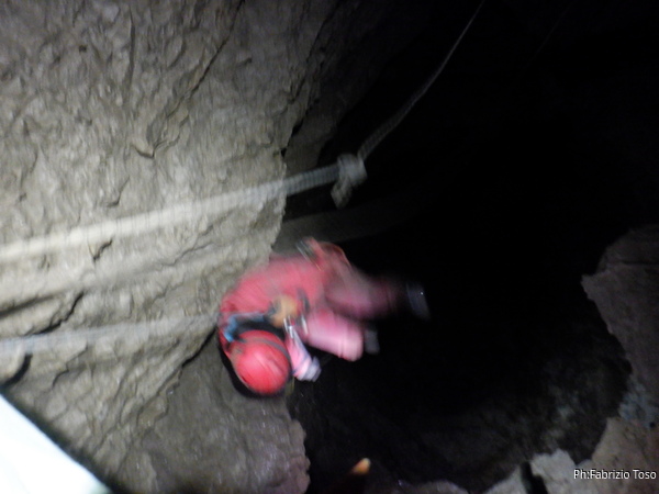 Vado avanti con il necessario per armare la discesa. Ci sono gia’ delle corde che armano la via per una diramazione in esplorazione da parte di altri amici. Sistemo la nostra corda e metto anche gli attacchi necessari per potermi assicurare e dare una mano a chi scendera’, ma senza intralciare troppo il passaggio. Per prima propongo Eirene, sicura e affidabile passa velocemente e scende nel buio.