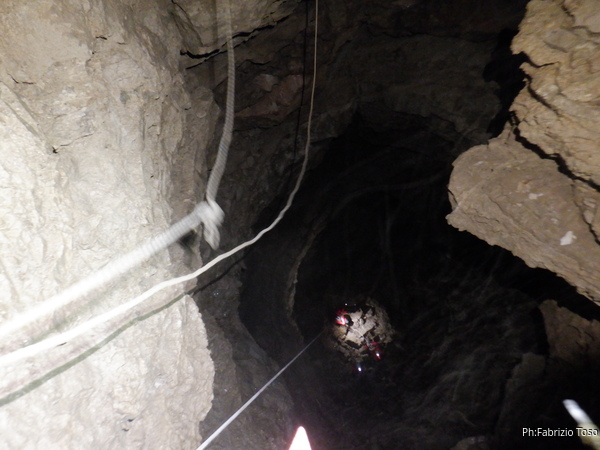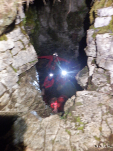 La sequenza stavolta e’ diversa, sono avanti per primo e quando l’armo e’ pronto faccio scendere Alessia per mostrarle il pozzo poi scendo e le faccio sicura. Di seguito scende Eirene, quindi Federica e Luca a chiudere la fila.
