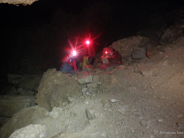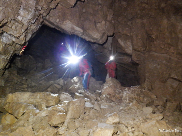 Sono ancora intento a guardare vari buchi infimi e senza aria quando sento Alessia, di ritorno dalla sua esplorazione, che mi chiama per tornare indietro. Affrontiamo rapidamente la salita per tornare al salone dove troviamo i nostri comodamente accampati che sistemano le loro cose per il pranzo.