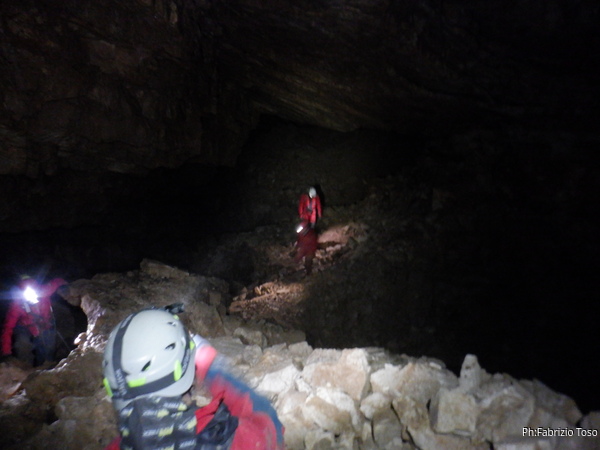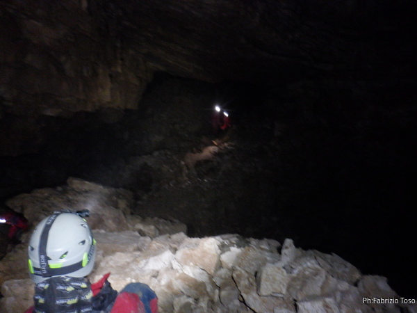 Eccoci nei pressi del salone del Trentennale. Una foto buia per salutarlo. Allieto i miei amici con il racconto dell’origine del nome del salone che gli e’ stato imposto per ricordare degnamente i 30 anni di esistenza del mio gruppo d’origine, lo Speleo Club Roma. Questo succedeva alla fine degli anni ’80, il trentennale e’ diventato “vecchio” con noi e il gruppo SCR ha gia’ festeggiato i suoi primi 60 anni!