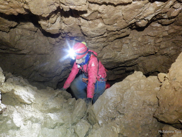 Federica che esce da uno dei passaggi. E’ l’unica che, per pigrizia e prudenza, dice, si e’ lasciata addosso tutta l’attrezzatura. L’attrezzatura pesa quasi quanto lei, quindi sta praticamente portando peso doppio. Per fortuna e’ una ragazza energica.