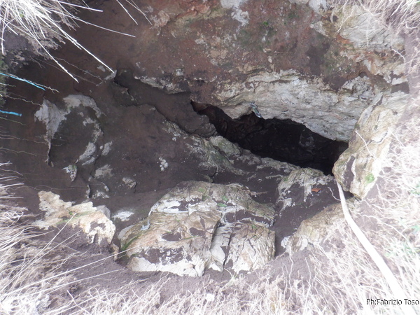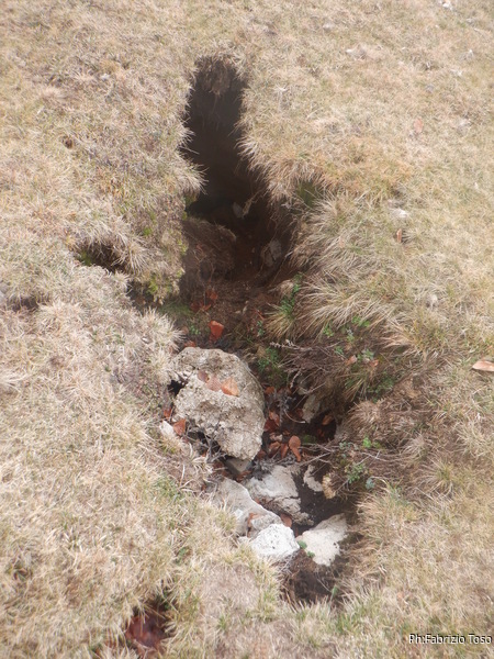 Appena pronto mi carico lo zaino del materiale da scavo, la corda e il resto del necessario per scendere. Faccio una breve deviazione a vedere un cunicolo che ispeziono’ Giuseppe qualche tempo fa. Si e’ fatto piu’ interessante sprofondando di almeno un metro ma c’e’ ancora troppa terra per pensare di affrontarlo. Lo terremo d’occhio per vedere se cresce.