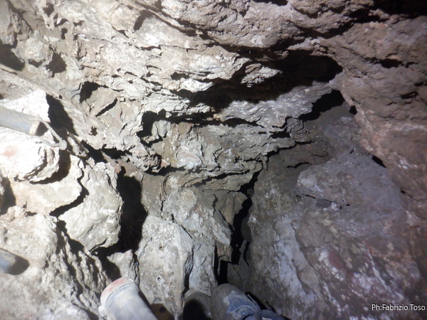Ma va tutto bene, nulla di grave, tanto l’infangata era gia’ messa in conto. Ci attrezziamo per lavorare alla strettoia. Io mi infilo dentro al cunicolo, per ora, terminale e preparo il necessario. Per prima cosa tentiamo con i soliti fori di trapano da 40 centimetri ma il sistema stavolta non sembra voler funzionare. Le proviamo tutte e dopo almeno un’ora di tentativi vani, lasciamo perdere.
