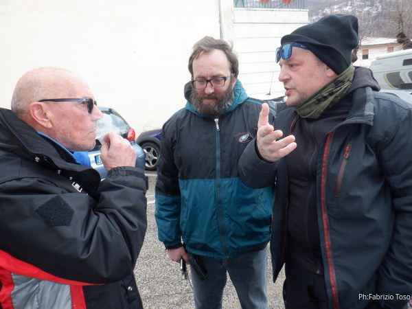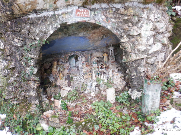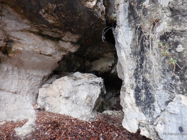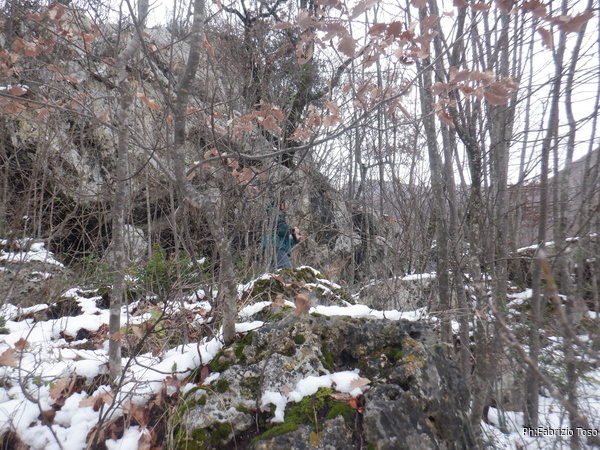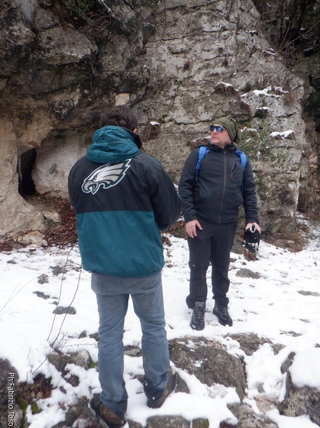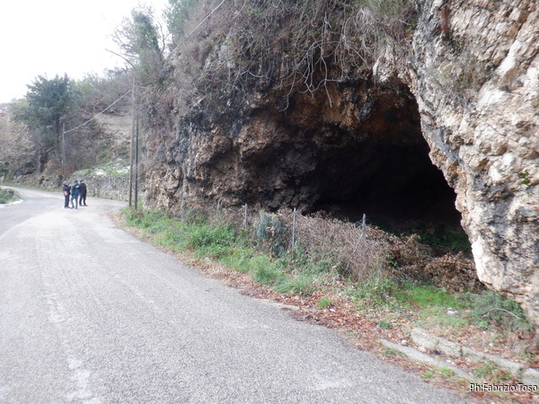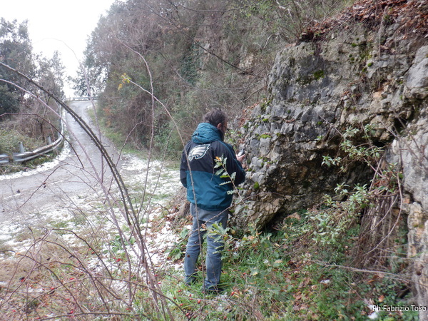 Partiamo. Tarcisio inforca la sua bici e noi lo seguiamo in macchina. Per prima cosa andiamo a visitare una grotta facile da trovare e con il nome auto-esplicativo di “Grotta sopra la strada per Fonte Filette”. E’ un ampio sgrottamento, abbastanza fondo da essere catastabile ma senza evidenti prosecuzioni.