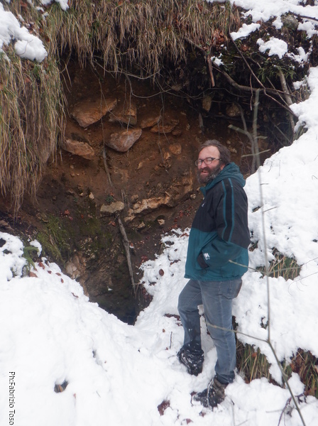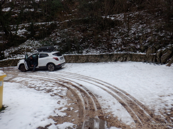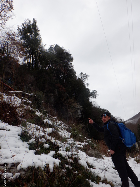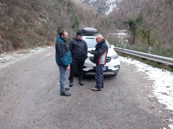Dopo la ricerca poco soddisfacente vicino alla cartiera riprendiamo la macchina, Tarcisio sempre con la bici e andiamo sulla strada di San Luca. Ci fermiamo ad uno spiazzo subito dopo un ripida salita. Tarcisio ci mostra un paio di buchi non a catasto che promettono bene.