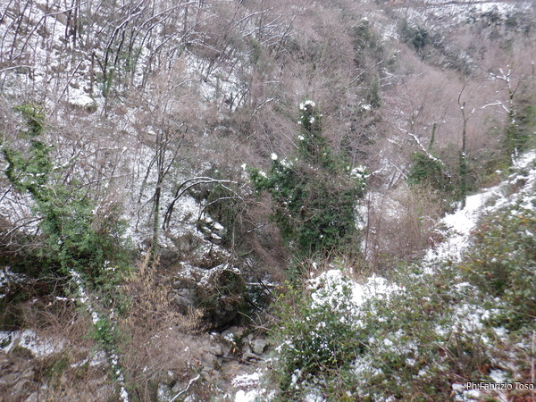 Sempre con la guida del GPS di Gabriele torniamo al cancello. La grotta e’ tra noi e il fondo della valle dove scorre una buona quantita’ d’acqua. Corrado ed io scendiamo per un sentiero accennato che scende tortuosamente giu’. Gabriele ci guida da sopra.