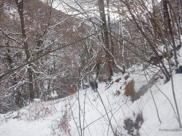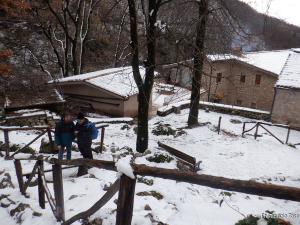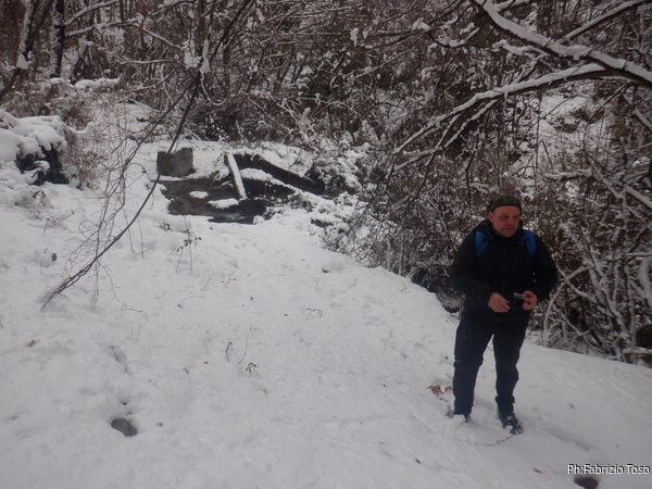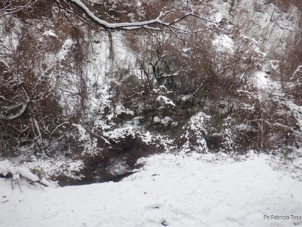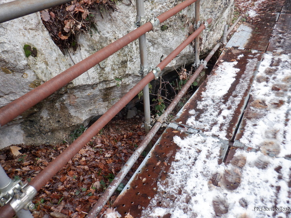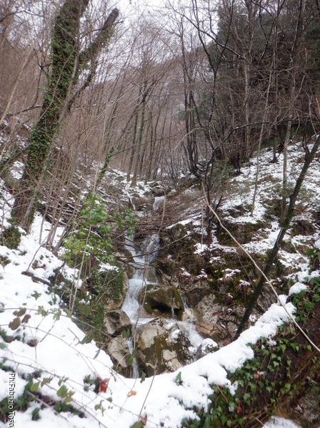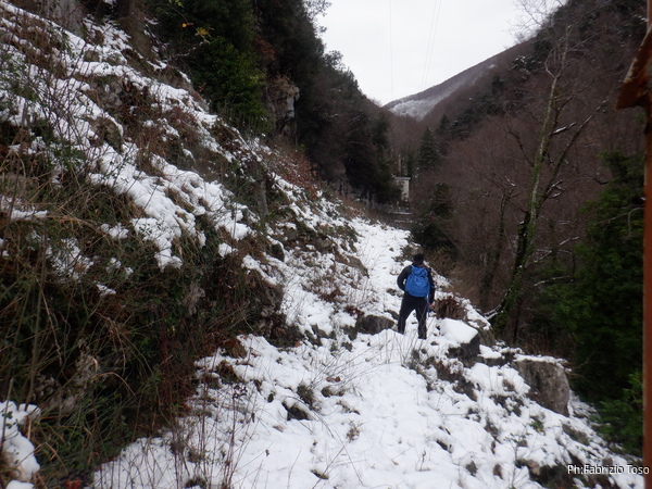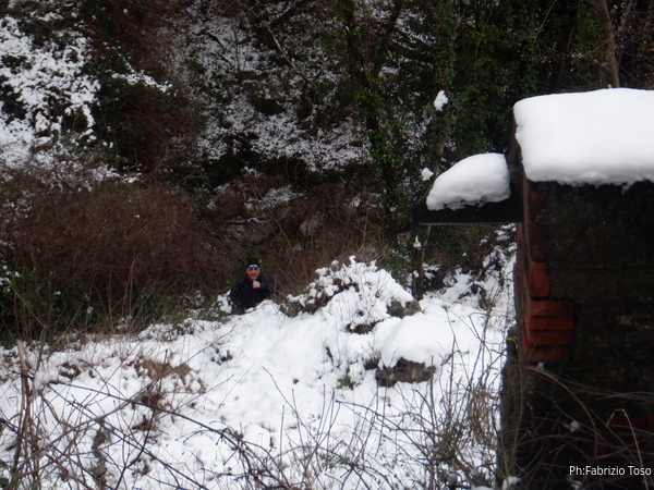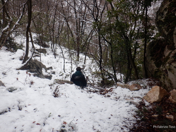 A valle l’acqua scorre con fragore. Dall’altro lato della montagna alcuni buchi ci invitano ad andare a trovarli ma sara’ per la prossima volta. Facciamo ancora una sosta per mangiare un boccone e gustare il caffe’ caldo portato da Corrado, poi ripartiamo.