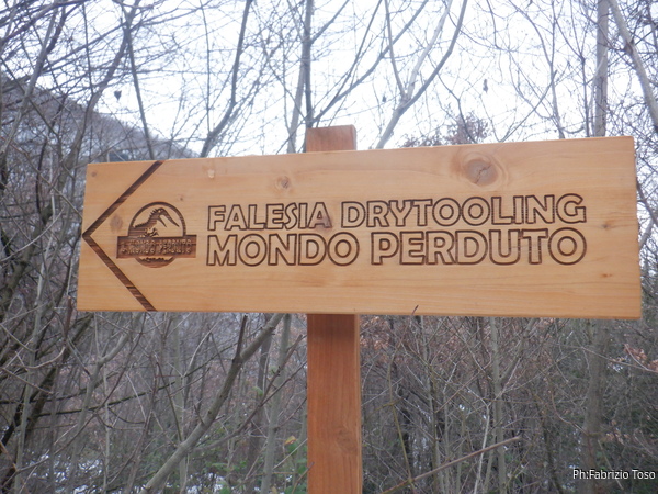 Incontriamo ancora una palina che indica il mondo perduto nominandola “falesia drytooling”. Interrogo i miei amici sul significato di queste parole ma anche loro confessano ignoranza.