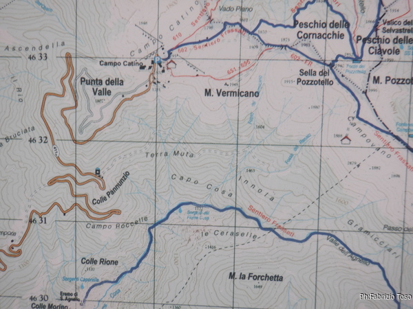 Questo e’ il dettaglio della cartina, in pratica quello che abbiamo seguito oggi e’ il “Sentiero Frassati”. Gia’ con la fantasia disegniamo il tracciato della prossima passeggiata: partenza dall’osservatorio, seguendo la strada fino alla grotta del Vermicano e quindi piu’ avanti fino ad incontrare il “Sentiero Frassati” che utilizzeremo per tornare nei pressi dell’osservatorio. Dove il sentiero curva verso l’eremo dovremo deviare facendo un poco di fuoristrada, buono per la ricerca grotte.