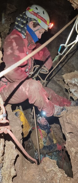 Alla partenza del P50 non troviamo sorprese particolari. Le due vie armate sono sempre la’ ad attenderci. Io scelgo la corda rossa e lascio ad Alessia la corda bianca. Inaspettatamente Luca sfodera il cellulare, avevo archiviato con un sospiro l’idea di avere foto in grotta di questa uscita. Luca mi salva regalandomi alcuni scatti.