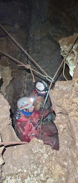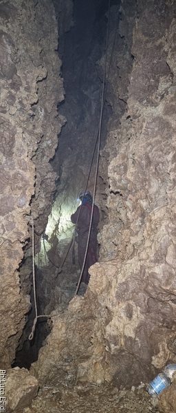 Dopo lo spuntino riprendiamo i lavori. Sorbendo il caffe’ mi sono convinto che con il demolitore non riusciremo a concludere molto quindi passo a dare corpo al tentativo che ho pensato. Coinvolgo i miei amici spiegando loro cosa faremo. L’idea e’ quella di usare il passaggio in cima alla risalita per lanciare una corda oltre e poi utilizzarla per risalire partendo dal meandro. Per fare quello che voglio fare devo recuperare una corda da almeno 15 metri. Ci pensavo su bevendo il caffe’. Chiedo a Luca se alla strettoia ci fosse per caso una corda, la risposta e’ no. Alla fine decido che l’unica maniera per rimediarla e’ quella di sacrificare il primo tratto di una delle due corde del P50. Dovrebbe essere circa della lunghezza giusta. Mentre salgo, recupero la corda e scendo chiedo ad Alessia di salire in cima alla risalita e a Luca di andare al meandro, passato il cunicolo.