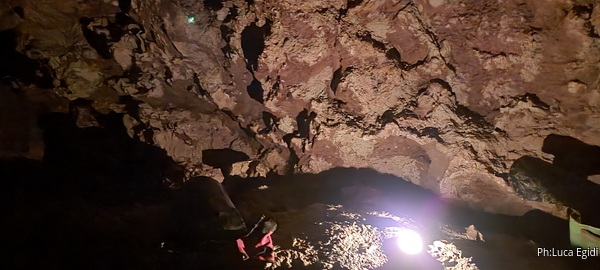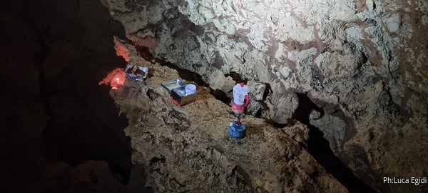Spiego brevemente ad Alessia e Luca dove siamo, quali sono le tre diramazioni della grotta da questo punto e quello che vorrei fare. Alessia propone un caffe’, noi accettiamo con piacere e lei si attrezza per farlo.