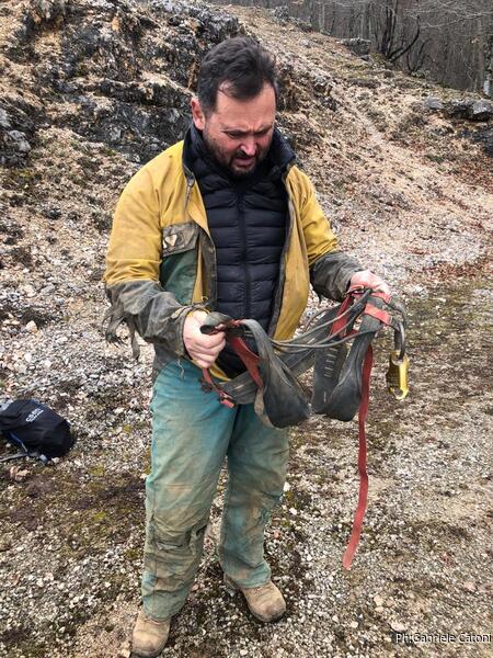 Una volta ricomposta la squadra in tutti i suoi elementi, terminiamo di riporre le attrezzature, i vestiti da grotta e ripartiamo. Al ritorno il mio enorme zaino giallo pesa almeno il doppio che all’andata, tanta e’ l’acqua che ho accumulato nei vestiti. L’ultima tappa e’ al magazzino dove incontriamo Nerone e gli facciamo una breve relazione verbale di quanto abbiamo combinato oggi. Gli diciamo anche del fatto che in fondo alla strettoia abbiamo trovato tracce di tentativi di disostruzione e pattume vario che sicuramente non ci appartengono, nulla di male, la grotta e’ di tutti, ma sarebbe bello che chi lo fa lo dicesse, basterebbe un cenno tramite social. Bah! Problemi di convivenza tra speleologi che esistono da sempre e sempre rimarranno irrisolti. Fa nulla, pero’ speriamo che la prossima volta almeno ripuliscano un poco.