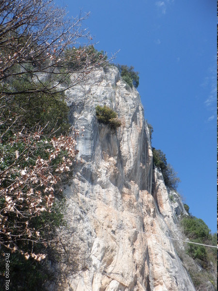 Arrivati dunque sulla nuova strada, fatti pochi passi ecco che ci si palesa davanti agli occhi una bella parete. Il nostro accompagnatore ce la indica: “Ecco, questa e’ la Morritana”.