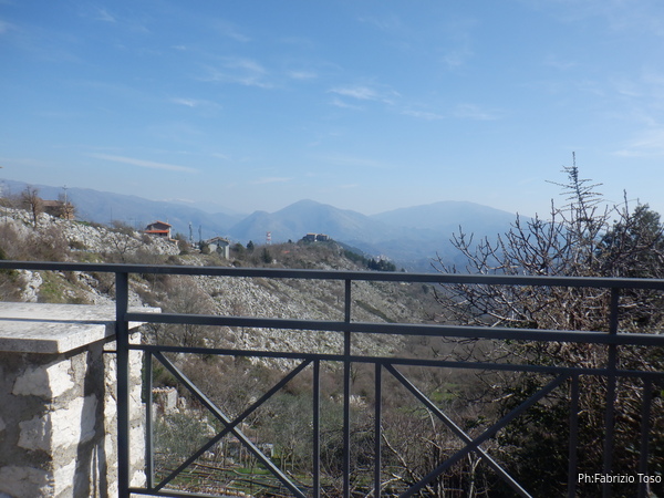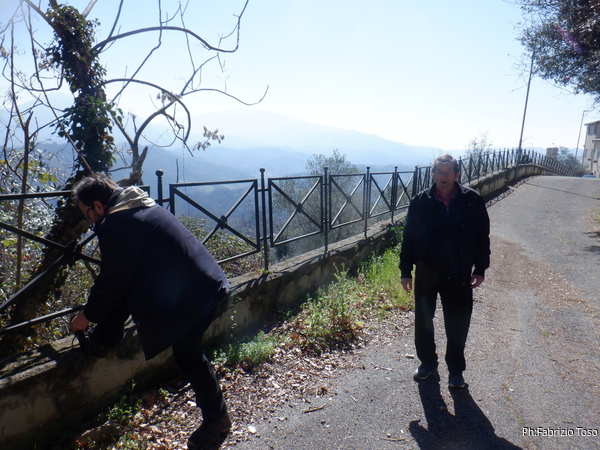 Arrivati in cima di sentieri non se ne vedono. La strada termina con un piazzale e in fondo inizia una viuzza a scalini che scende nel paese. Mentre siamo ancora interdetti e indecisi vediamo passare un uomo al quale mi affretto a chiedere informazioni. Gli spieghiamo cosa stiamo cercando e stavolta e’ lui a rimanere interdetto, ci dice: “La Morritana e’ la’, da quella parte. Pero’ io sono nato qua e non ho mai sentito parlare di grotte vicine alla Morritana”. Una chiacchiera tira l’altra, tanto che alla fine decide di accompagnarci. Ci indica un sentiero in discesa che porta ad un’altra strada asfaltata di cui non immaginavamo l’esistenza. A meta’ del sentiero ci indica anche un punto in cui un suo conoscente aveva ricavato un riparo per il somaro. Ci inoltriamo subito tra rovi e ginestre per dare uno sguardo ma risulta nulla di interessante.