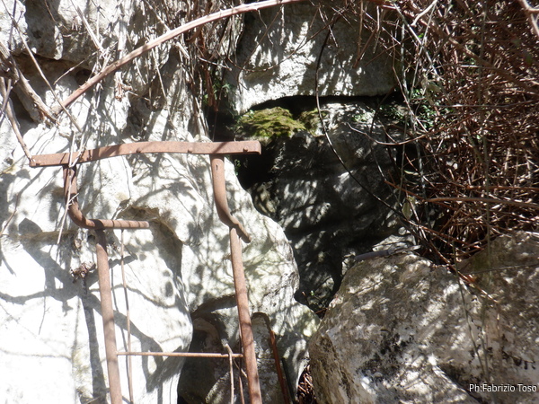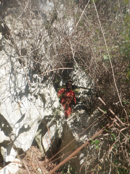 Arrivati alla macchina accendiamo il GPS, leggiamo l’irridente messaggio per cui, secondo lui, mancano circa 200 metri e iniziamo a salire. La salita non e’ migliore della volta scorsa ma stavolta sono meglio equipaggiato e pronto a tutto. Con fatica ci avviciniamo al punto dove dovrebbe esserci l’ingresso della grotta.