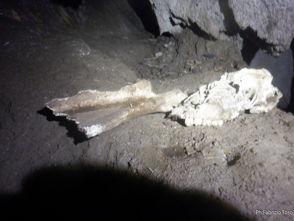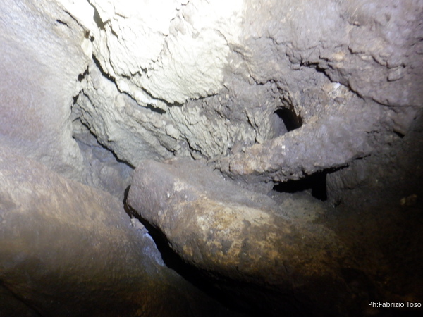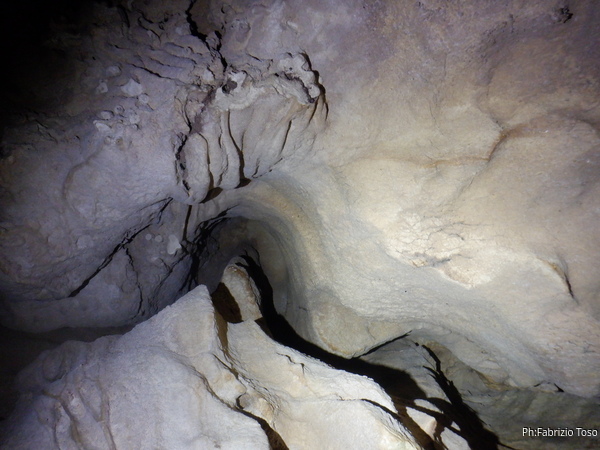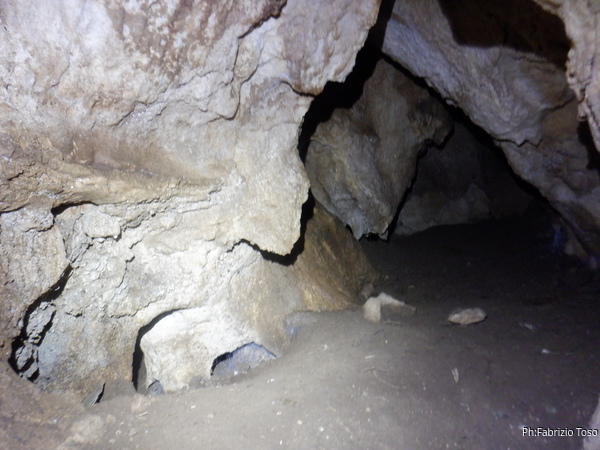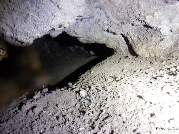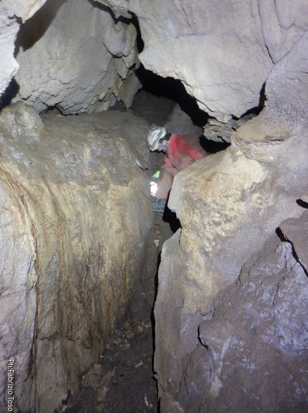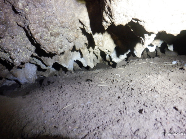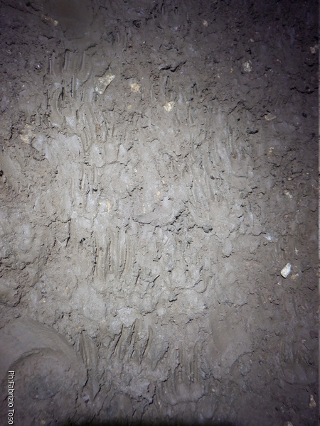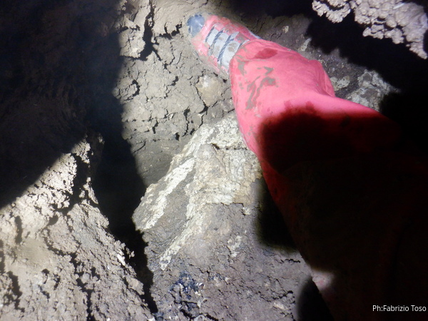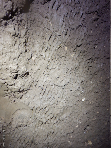 Oltre il punto basso la grotta risale e si produce in una sala col pavimento interamente in fango che sale con decisione. La grotta deve essere frequentata da qualche animale, forse un istrice, che ha lasciato le sue impronte sul fango nel tentativo di salire o scendere il pendio fangoso.