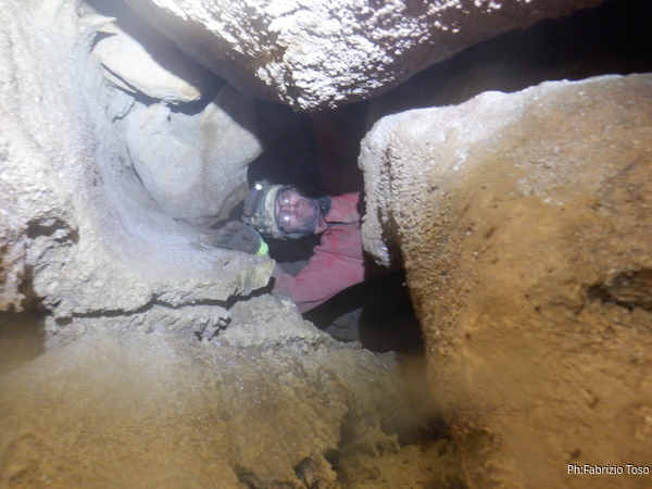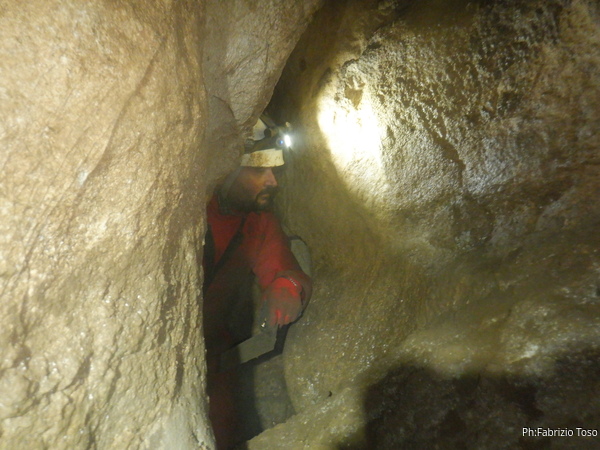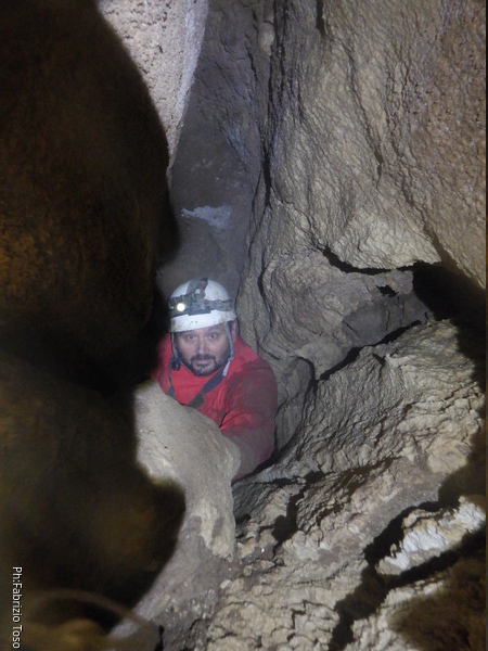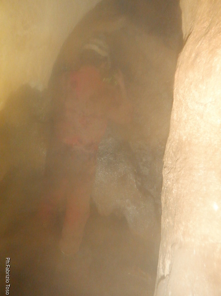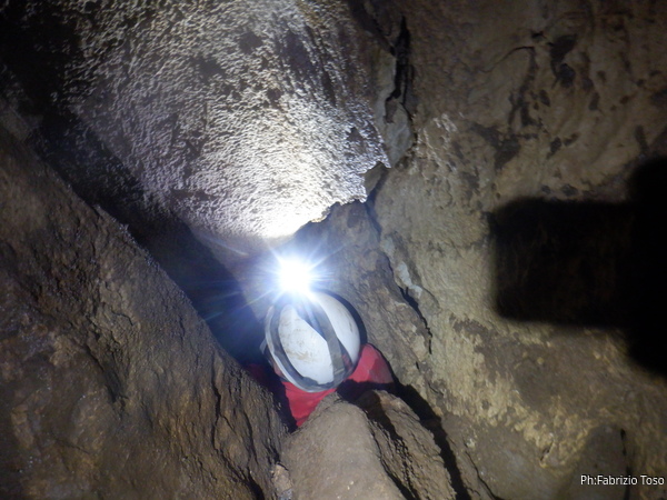 Ora ai miei piedi c’e’ ancora fango, la spaccatura diventa stretta e lunga. La grotta sembra proseguire sia davanti a me che alle mie spalle. Trovo un sasso e riesco a lanciarlo alle mie spalle, verso il basso. Lo sento “tonfare” dopo un paio di metri ancora. Davanti non riesco a vedere. Con rassegnazione mi accingo a risalire. Prima di partire faccio una foto a Gabriele che mi assiste dall’alto.