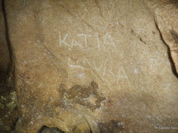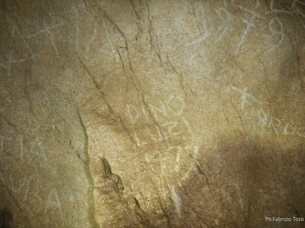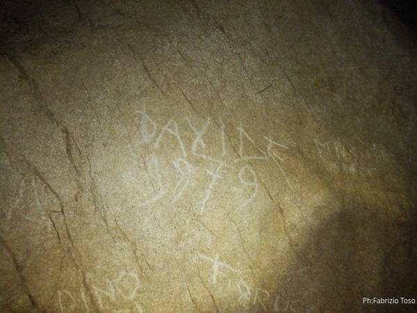 Riprendiamo la strada per l’uscita. Nella saletta dove si affaccia il pertugio alto io vado avanti e Gabriele si sofferma ad osservare le pareti della piccola sala. “Ma qua ci sono dei nomi incisi!” esclama. Gli ripasso la fotocamera ed eccoli qua.