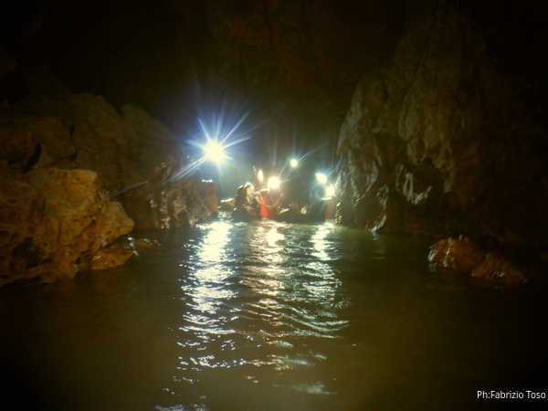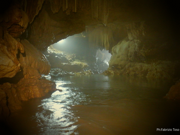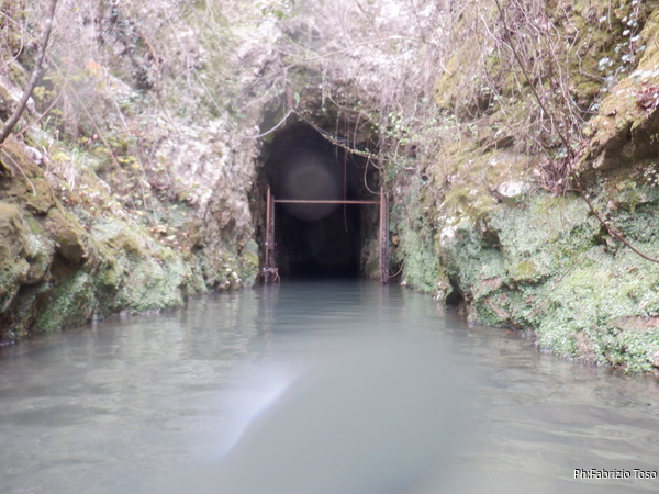 Procedo in solitaria per il tunnel iniziale, e’ artificiale e scavato per bypassare il sifone che si trova sulla destra entrando. In questa maniera le piene sfogano con maggiore velocita’. Dopo il primo tratto artificiale inizia la grotta vera e propria. In un punto quasi asciutto che non ricordavo affatto trovo uno speleo in attesa. Non lo conosco, forse e’ uno dei ragazzi che fanno servizio alla grotta insieme a Giuseppe e Augusto. Lo saluto velocemente e passo oltre.