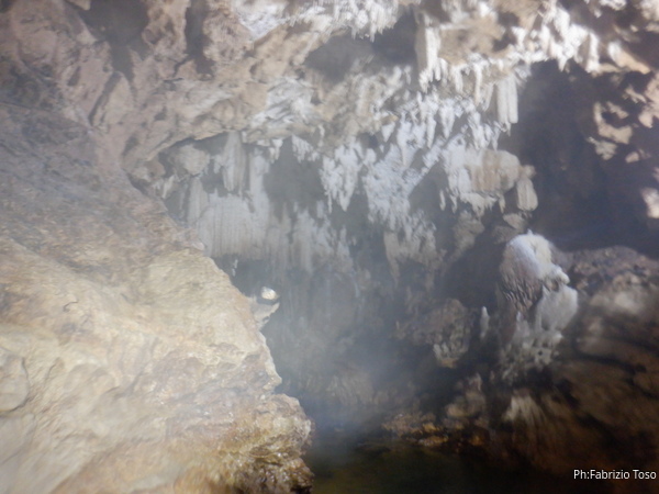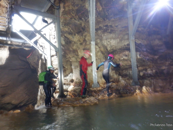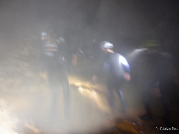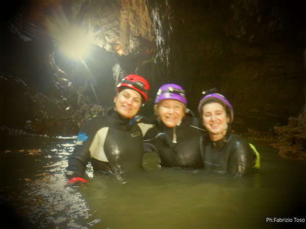 Come sempre non posso azzardarmi ad indossare da subito la muta intera, metto addosso quella minimale, raccatto tutto il resto e mi avvio piu’ in fretta che posso visto che sono rimasto ultimo. Per fortuna a farmi compagnia durante il tragitto dalla segreteria all’ingresso della grotta vengono Claudia e Luna, cosi’ facciamo la strada chiacchierando con piacere del piu’ e del meno poiche’ e’ veramente tanto tempo che non ci vediamo.