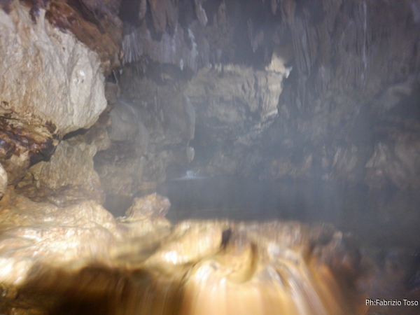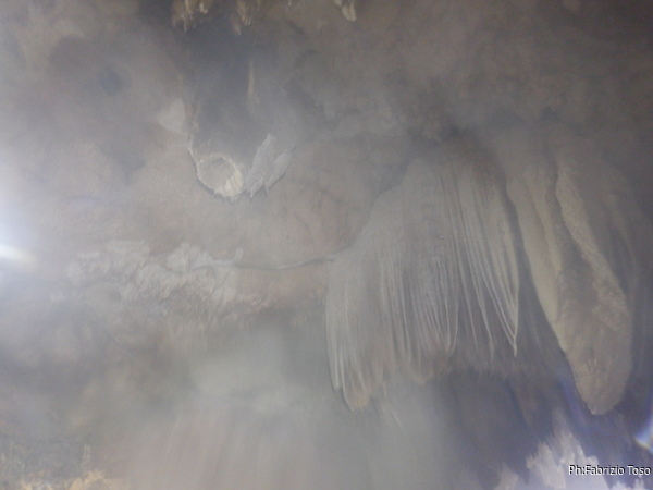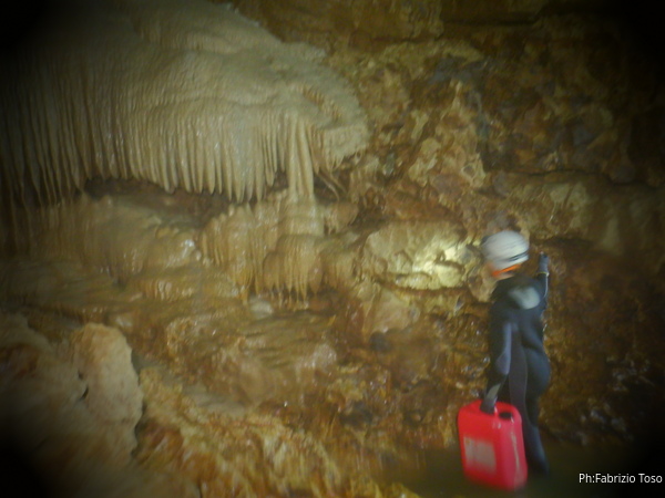 Incrociamo il gruppo di Augusto che e’ di ritorno dalla “medusa”, la caratteristica quanto gigantesca concrezione che e’ uno spettacolo da vedere. Augusto si ferma un paio di minuti a parlare con la “squadra del bidone” che intanto riprende fiato.
