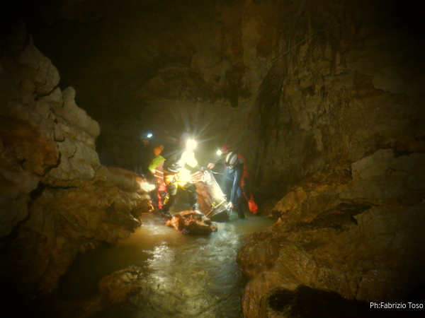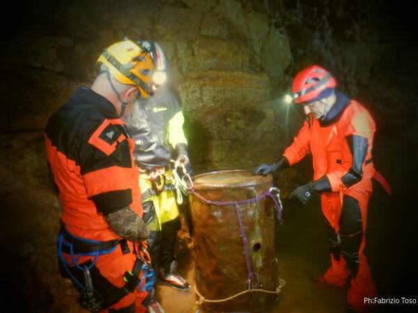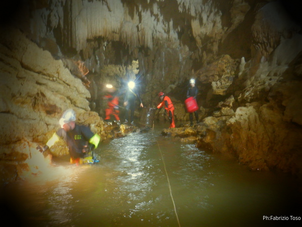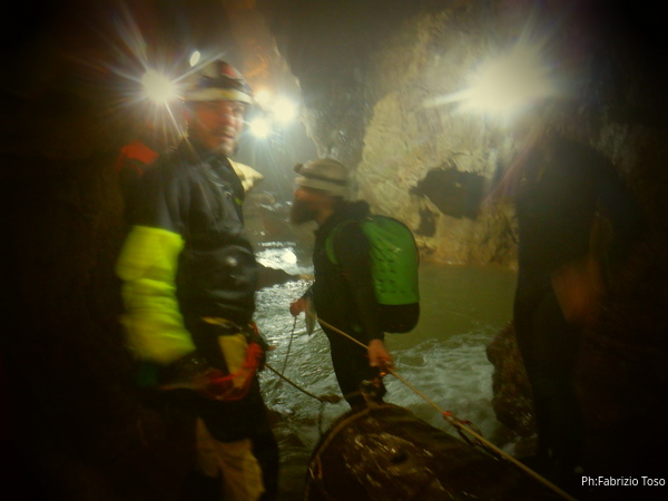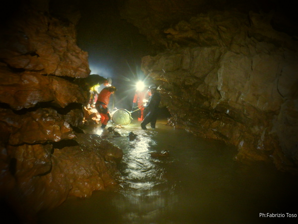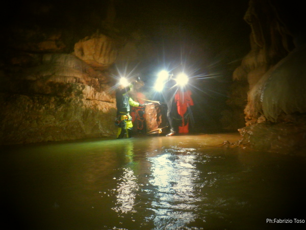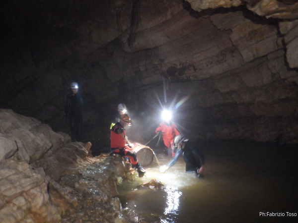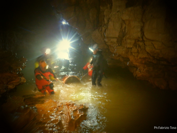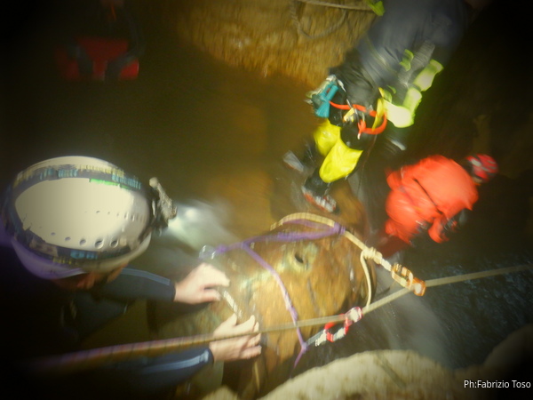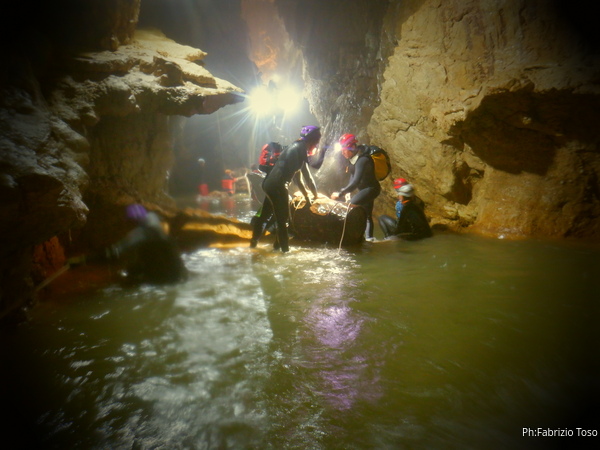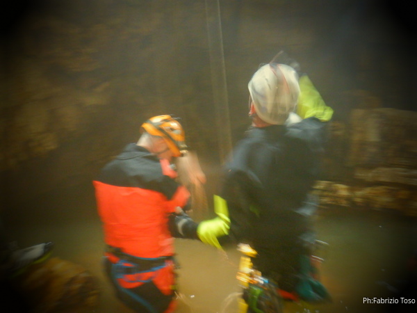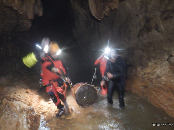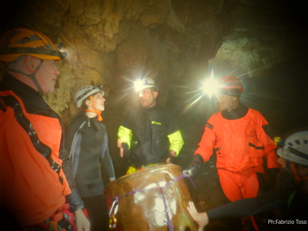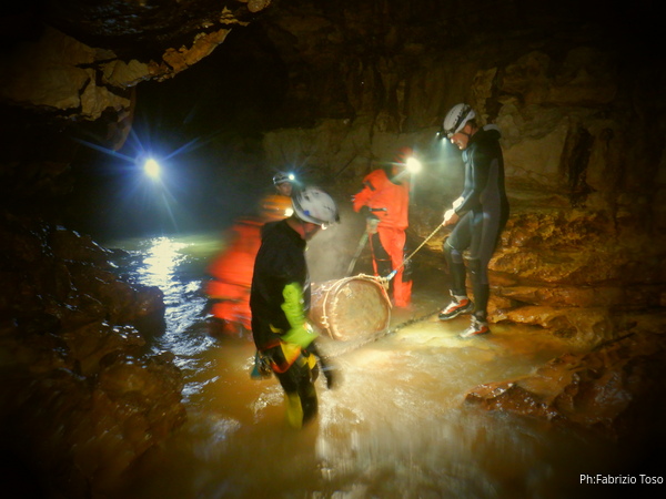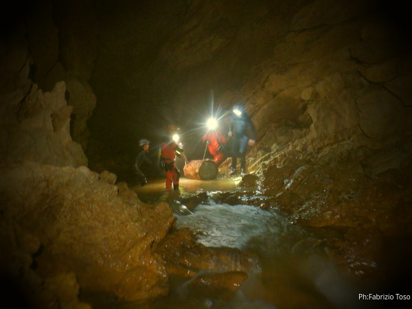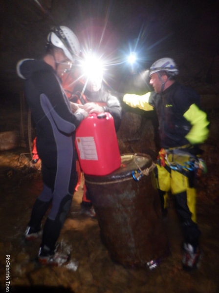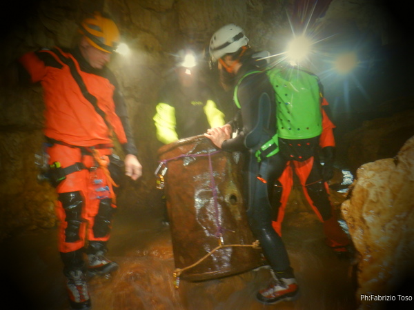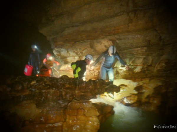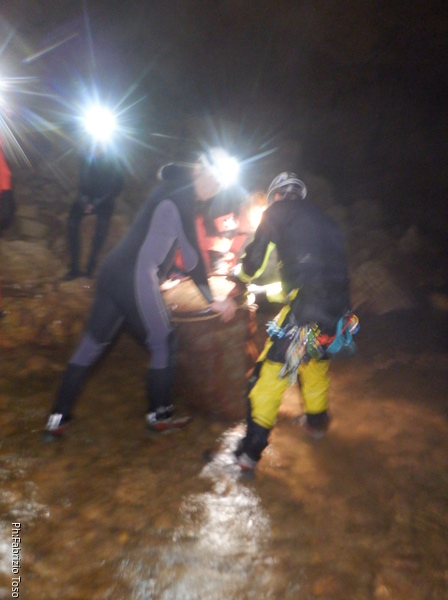 Andando verso l’uscita aumentano i punti con l’acqua alta. Ora si devono usare altri metodi di trasporto, ancora piu’ lenti ma che assicurano di non perdere il caro bidone nelle profondita’ delle acque. Praticamente ad ogni passaggio tiriamo fuori le corde dallo zaino, improvvisiamo una teleferica con una delle due corde e l’altra viene usata per tirare il bidone prima che affondi troppo. Dopo il passaggio si rimettono le corde nello zaino e si prosegue.
