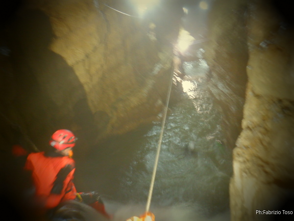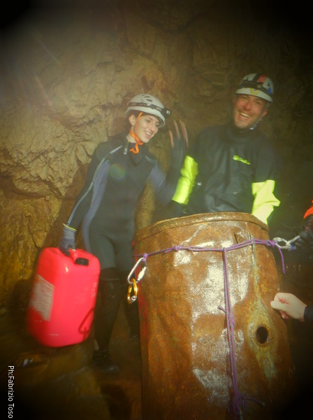 Una volta fissata la corda di teleferica da entrambi i lati, parte Fabrizio con la corda di tiro e poi il bidone scende velocemente e senza intoppi. Ora possiamo passare tutti. Vorrei tuffarmi quindi affido la mia fotocamera a Marta che si appresta a scendere con la corda. L’avrei portata con me ma l’ultima volta che ho saltato e’ entrata un poco d’acqua…non fanno piu’ le fotocamere di una volta!