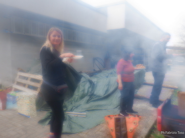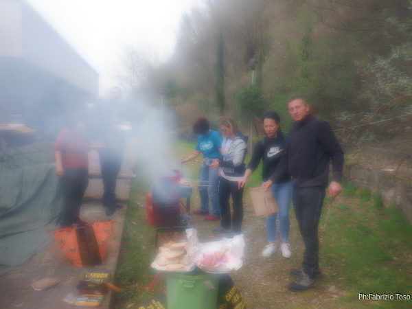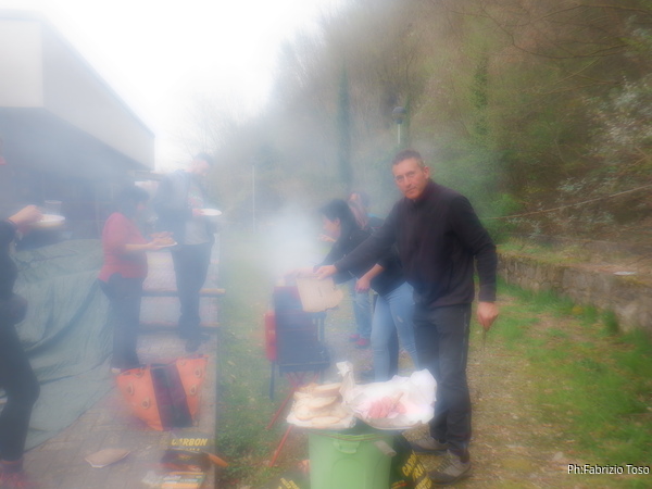 Pian pianino il pranzo prende corpo. Dopo un sostanzioso antipasto a base di bruschette, pomodoro, mozzarelle, formaggi vari, frittata agli aspragi selvatici e altre delizie, iniziano ad arrivare vassoi pieni di salsicce. Dopo essermi sfamato a dovere vado a fare visita ai fochisti che continuano a produrre salsicce e bruschette a profusione. Giuseppe per dare una mano prova a mettere bocca nel processo “cuciniero” ma se lo filano poco, e’ in minoranza.