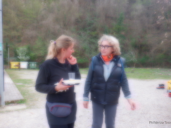 Dopo le foto fuggo come un ladro affrontando di buon passo e un gran fiatone la salita per tornare alla segreteria. Trovo Betta tranquilla, ha passato piacevolmente il tempo in compagnia di altre persone che sono rimaste fuori dalla grotta. Luna freme dalla voglia di saltarmi addosso per manifestare la sua contentezza per il mio ritorno dopo una lunga separazione. Dopo i saluti la prendo con me per andare a cambiarmi vicino alla macchina. Strada facendo avverto in segreteria della uscita del bidone. Una volta ripresi gli abiti asciutti torno al piazzale dove gia’ si inizia a vedere tanta roba buona da mangiare.