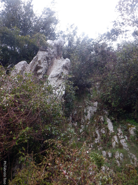 La grotta potrebbe essere vicino questo spuntone di roccia, i GPS indicano la’.
