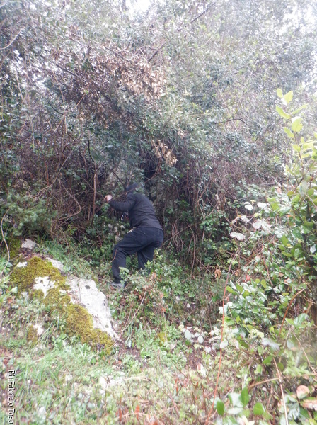 Gabriele trova il punto esatto indicato dal GPS…un cespuglio. Luca, che aveva cercato la grotta mesi prima, ci conferma che anche lui era arrivato qua trovando solo il cespuglio.