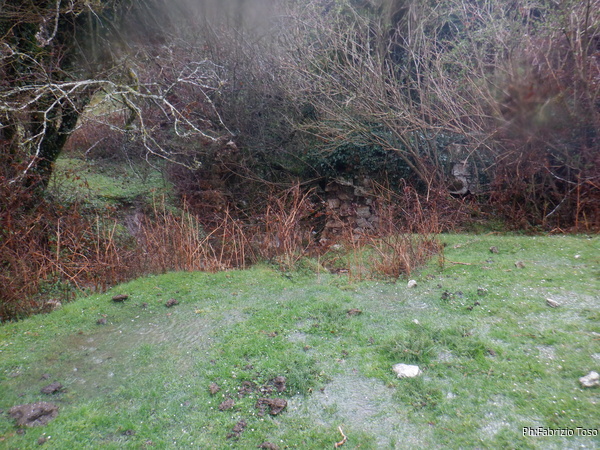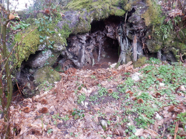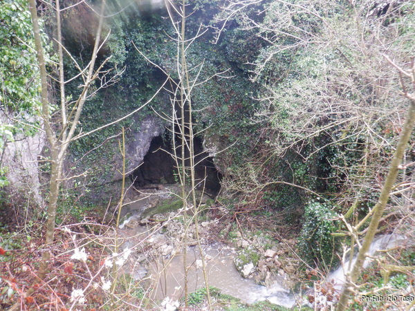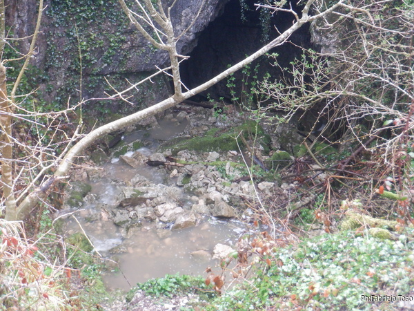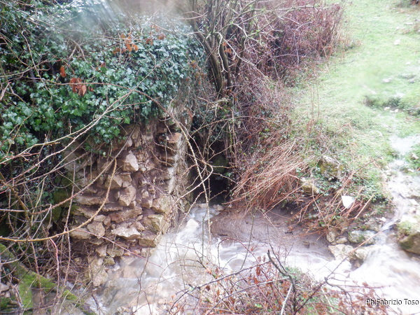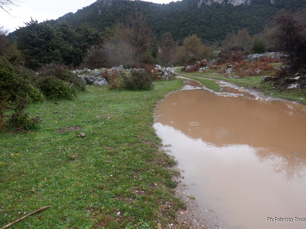 Per fortuna in quel momento la pioggia sembra aver deciso di concederci una tregua. Per arrivare all’ingresso si deve percorrere il fosso che incrocia la strada. Scendo con qualche difficolta’ a causa del fango e poi comincio a camminare per raggiungere l’ingresso. Solo dopo un po’ mi accorgo che i miei amici non sono scesi con me e mi seguono invece camminando comodi comodi sopra di me seguendo il bordo del fosso. Proseguo ugualmente, anche se solo ora ricordo di non preso dall’auto la fotocamera. Purtroppo la prosecuzione mi viene impedita da un laghetto che riempie il fosso per tutta la sua larghezza. Di bagnarmi i piedi non ho voglia, saluto l’ingresso con un “arrivederci” e salgo a raggiungere i miei amici. Nemmeno il tempo di salire e ricomincia a piovere. Ci sbrighiamo a tornare alle auto e riprendiamo a muoverci verso le grotte da cercare.