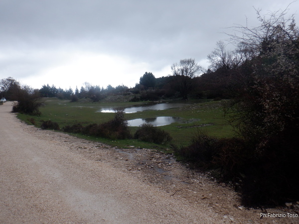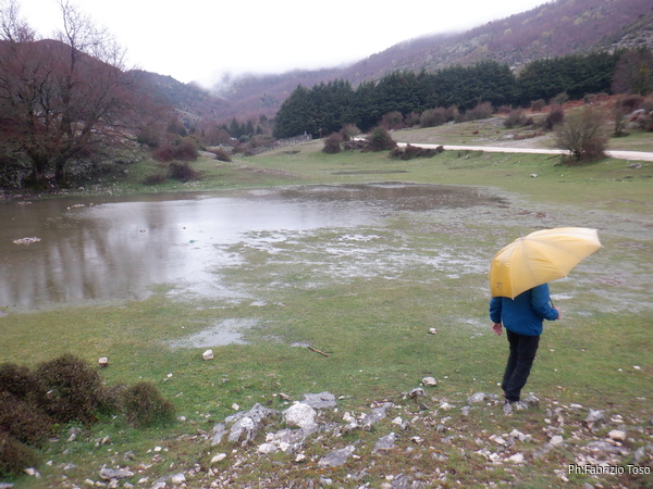 Consultiamo brevemente la sua lista per scoprire la meta successiva. Presto individuata, e’ il Catravasso sopra Pozzo Comune. Siamo vicini quindi decidiamo di raggiungerla camminando. Sorpresa, un laghetto! Nella bella stagione e’ solo uno spiazzo erboso che ospita spesso famiglie che fanno picnic, non ricordo di averlo mai visto in questa veste. Gli faccio subito una foto.