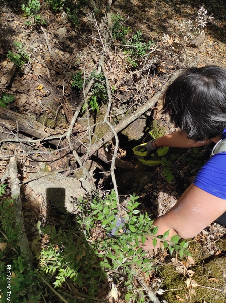Abbandoniamo la piana delle meraviglie e prendiamo una direzione che dovrebbe riportarci alla macchina. Strada facendo troviamo un notevole buco nel terreno. Ci diamo uno sguardo, sembra un bel buco, ci fermiamo a valutarlo.