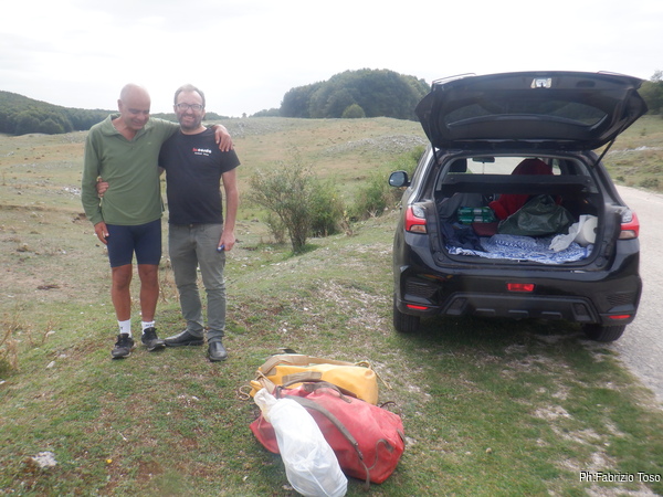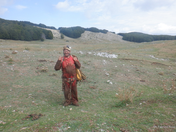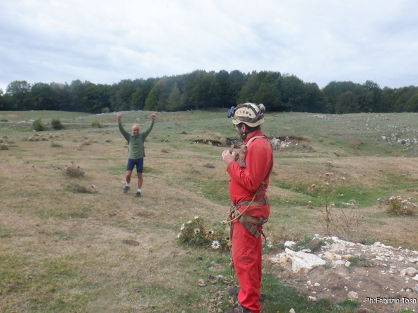 Sono pronto al minimo indispensabile, fa troppo caldo per vestirmi completamente. Prendo le mie cose e ingaggio Elia per portare gli zaini fino alla grotta mentre Gabriele termina i suoi preparativi. Passiamo davanti alla solita dolina e come al solito mi fermo a vedere in che condizioni e’.