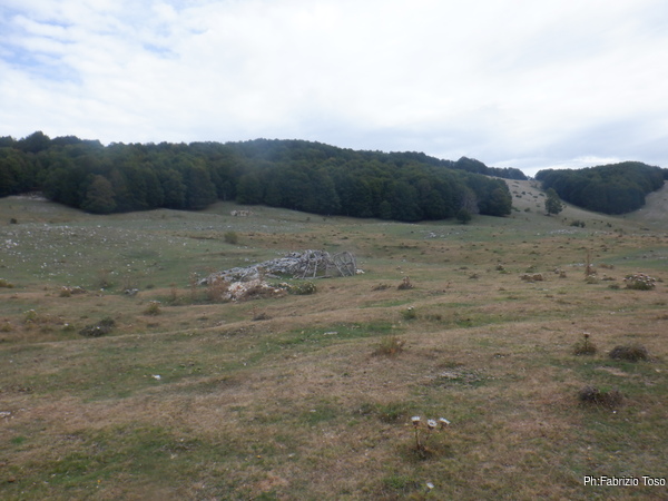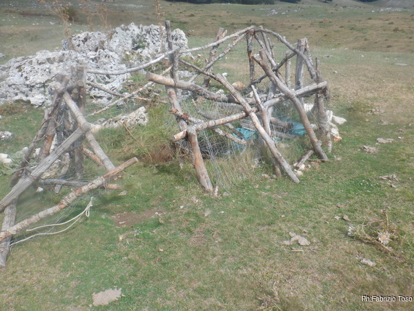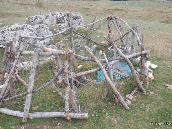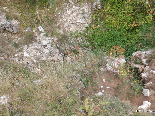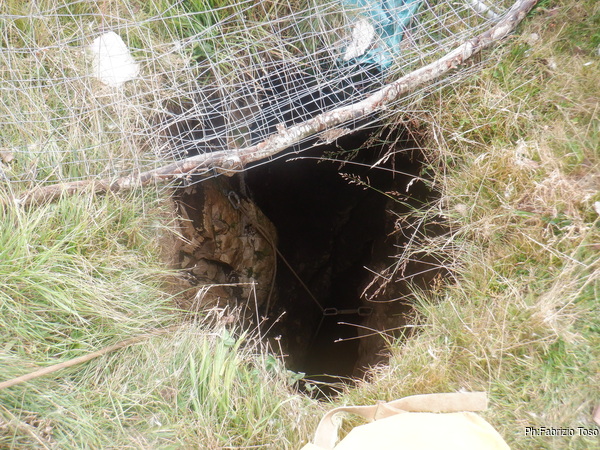 Vabbe’, diamo una sistemata sommaria al recinto scassato, apriamo l’accesso e andiamo a togliere i sassi incastrati tenacemente nella rete prima di scansarla e mettere la corda per scendere.