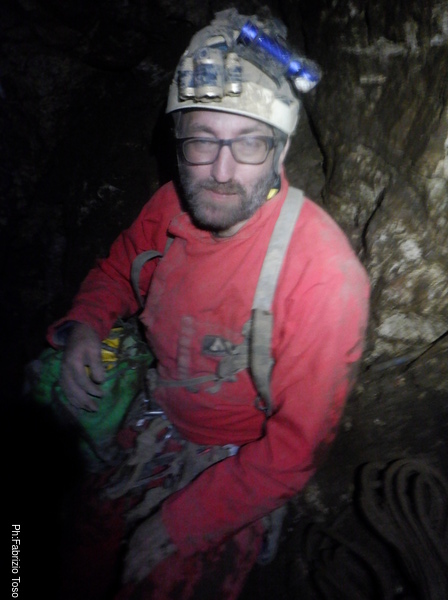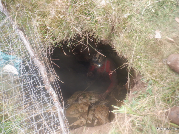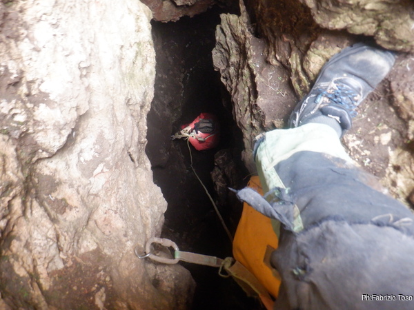 Eccolo che arriva. Facciamo il lavoro di disgaggio delle pietre pericolanti…in verita’ la mia intenzione era di tirarle fuori ma non faccio a tempo a dirlo che Gabriele le ha gia’ scaraventate giu’. Peccato, andranno sicuramente a finire dentro il cunicolo fangoso e ci tocchera’ farli uscire con fatica la prossima volta.