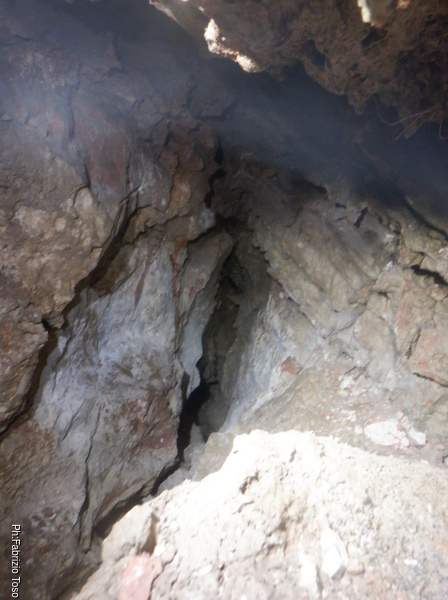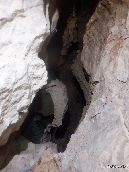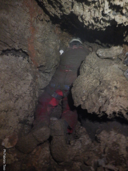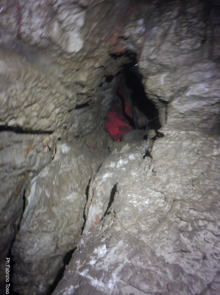Lavora lavora e poi ancora lavora. I risultati alla fine si vedono, nulla di eclatante, pero’ ci si deve accontentare. Il passaggio di arrivo alla saletta ora e’ molto piu’ comodo, la via per l’ignoto ora lascia intravedere un ambiente minuscolo, sembra quasi una piccola marmitta, e la possibile prosecuzione del meandro sulla destra. La grotta si ostina a celare i suoi tesori tra anse di roccia, ci mostra solo quel tanto da tenere vivo l’interesse. Chissa’ se e quando decidera’ di svelarsi.