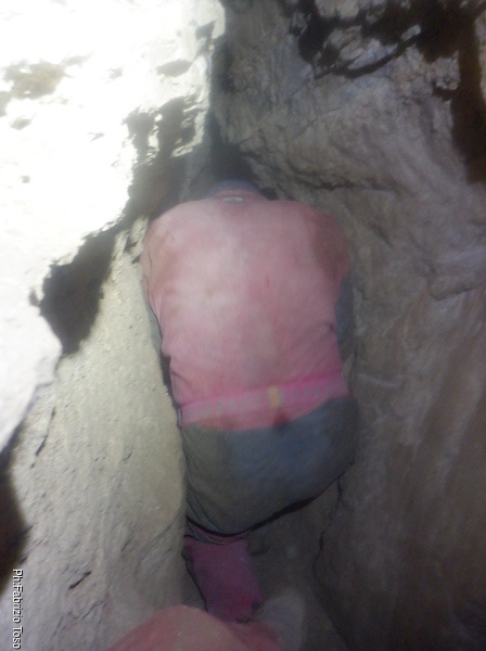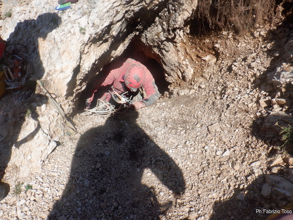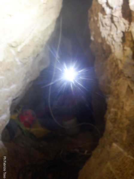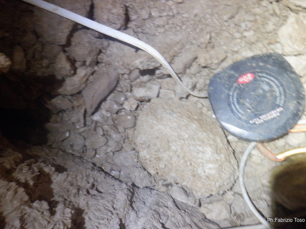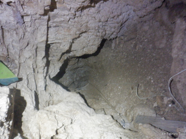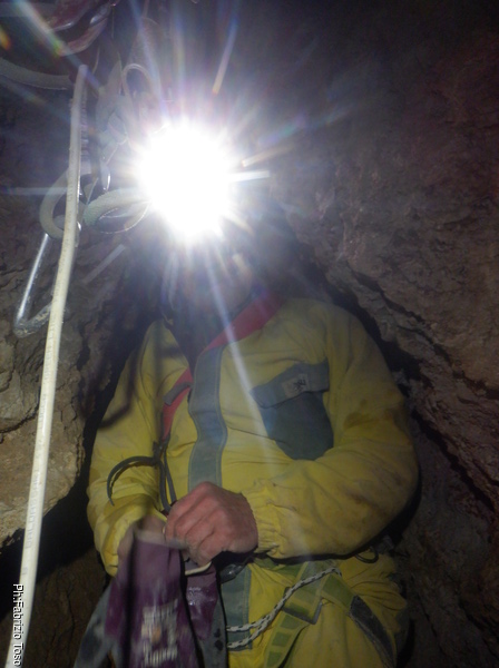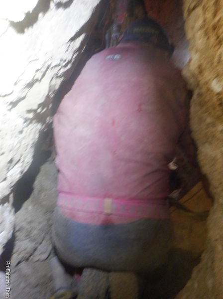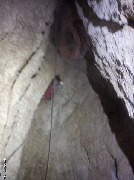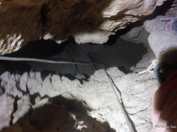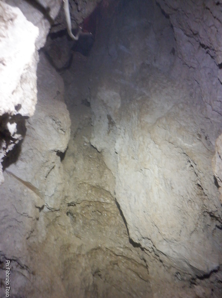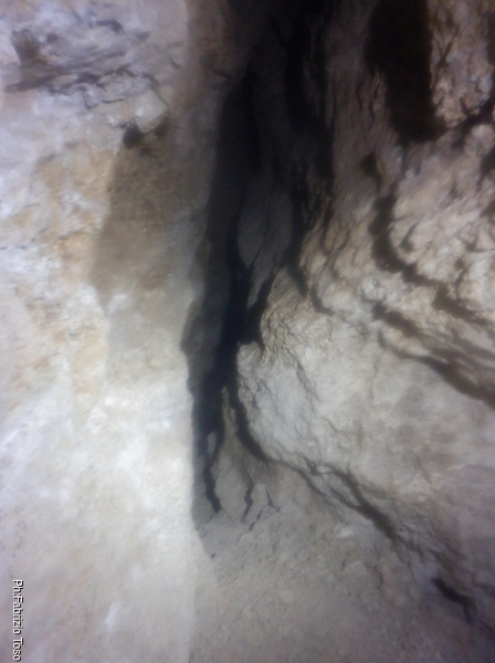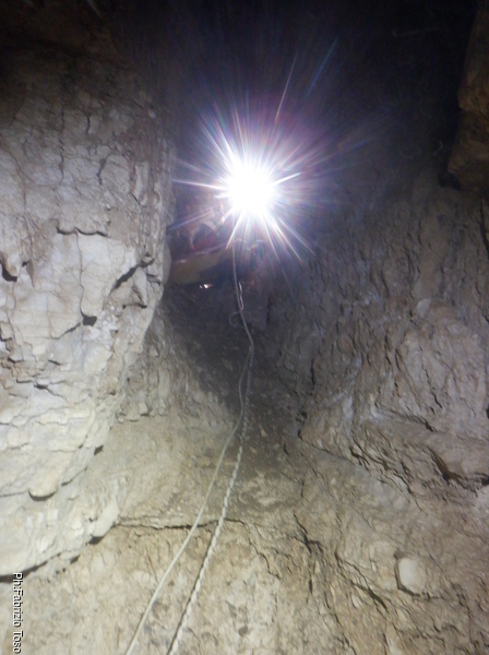 Terminato il rilievo della diramazione proseguiamo verso il fondo. Prendiamo il meandro in quella direzione e lo seguiamo, prendendo i punti di rilievo, fino a un altro saltino. La partenza del saltino e’ stretta e la discesa e’ ostacolata da un ponticello di roccia da scavalcare nello stretto. La corda e’ attaccata piu’ indietro e appoggiata sul ponticello. Mi sembra una cosa scomoda assai quindi chiedo a Luca di passarmi il trapano con la punta da 6. Useremo uno dei multifix che abbiamo portato. Ancora una volta provo a metterlo con l’attrezzo “fattapposta” che ho con me. Vista la posizione in cui sono, scomoda assai, l’infissione del multifix e’ laboriosa e inoltre l’attrezzo mostra ancora qualche pecca di gioventu’ che dovro’ sanare. Dopo qualche imprecazione e tanti sbuffi comunque riesco nell’impresa. Attacco la corda e provo ad appendermi…sembra tenere. Bene! Si prosegue.