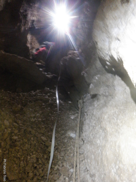 Scendiamo lentamente prendendo i punti, io annoio Luca con istruzioni varie su come riportare i dati, fare i disegni delle sezioni trasversali, la sezione della grotta e altre cose che mi vengono in mente via via.