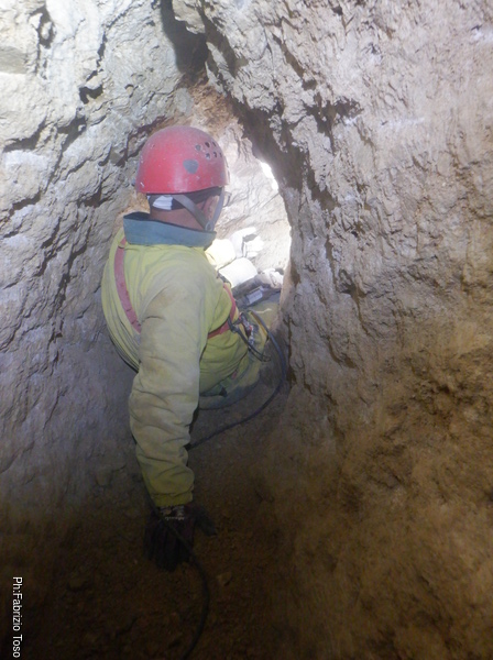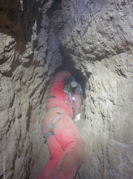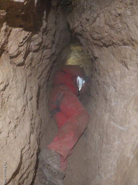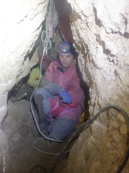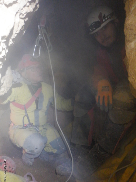 Alla base del saltino facciamo ancora un metro di meandro e raggiungiamo “il campo base”, una zona comoda dove attendere il proprio turno per lavorare piu’ avanti, nello stretto che ancora ci impedisce la progressione verso infiniti abissi.